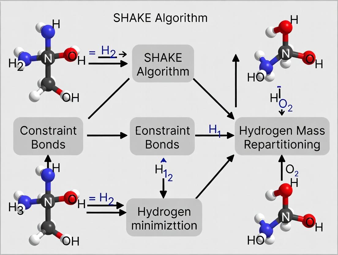 | HMR + SHAKE (All Bonds) | 2fs -> 4fs | Combines both high and low-frequency artifacts. | Vibrational spectra, kinetic pathways, convergence. |